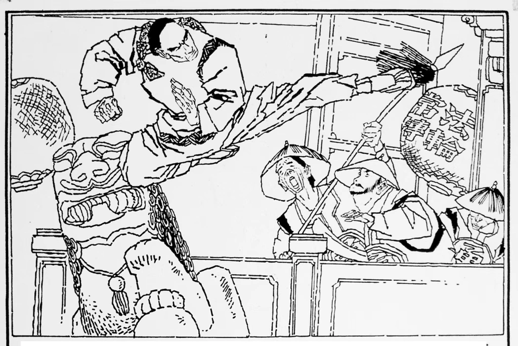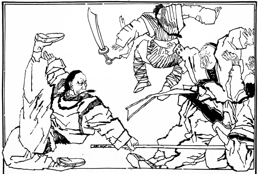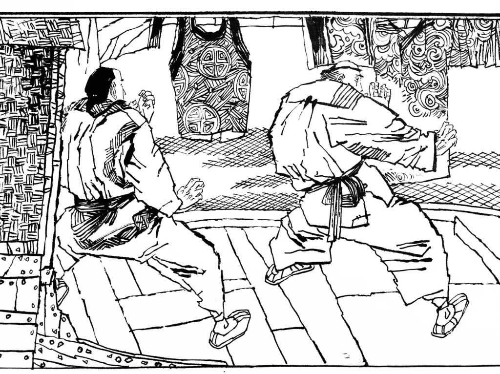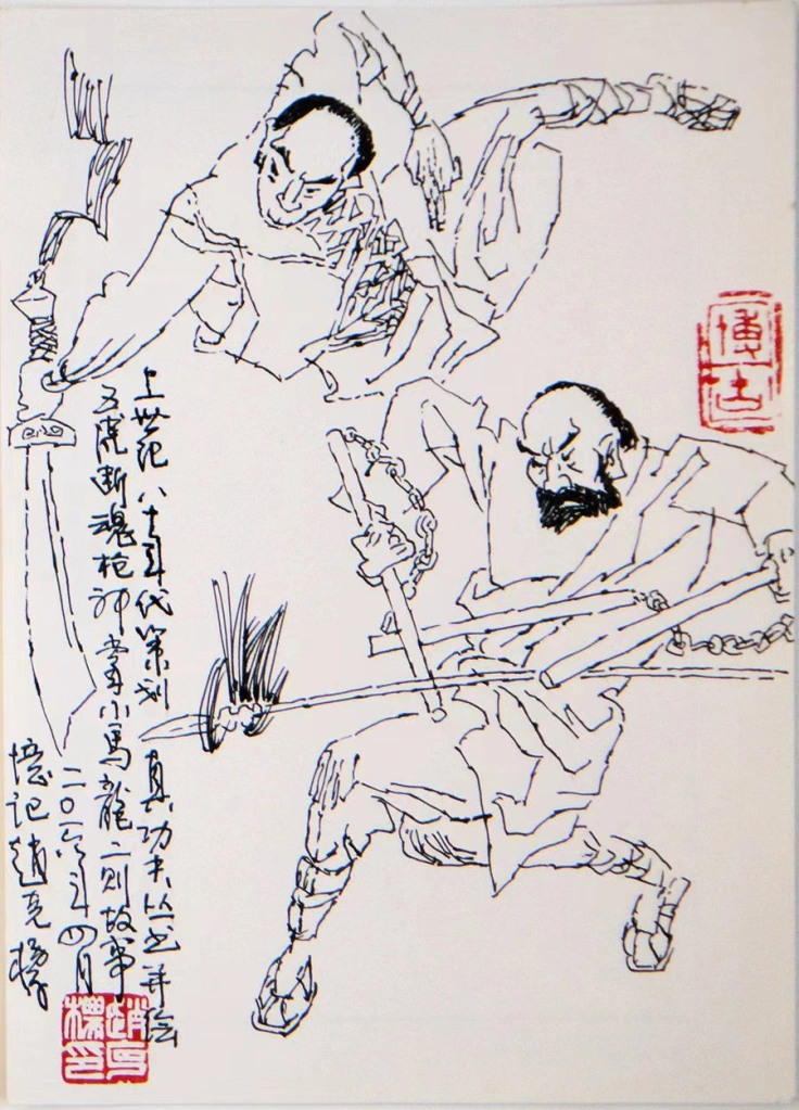 小时候爱看打斗故事,青春期迷恋英雄救美情节,初学画时临摹武将义侠,后来,通过画画终于能赚稿费了,就很爱表现武打场面,一招一式,吆吆喝喝,尽力画出劲道来,想象中的真功夫!其实也就些架势罢了,但正邪是分明的,好人胜出,坏人败退。