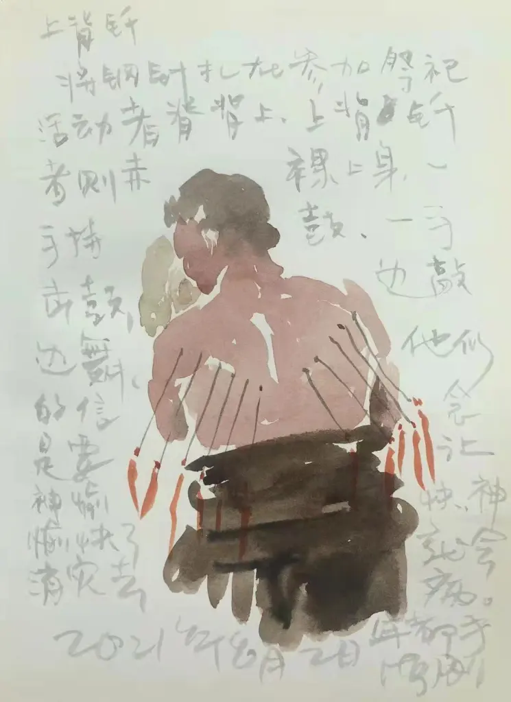 上背钎。将钢针扎在参加祭祀活动者的脊背上,上钎者则赤裸上身,一手持鼓,一手击鼓,边鼓边舞。他们的信念是要让神愉快,神愉快了,就会消灾去病。