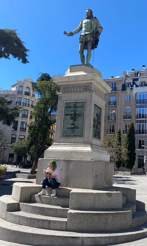 一位年轻女子静静地坐在塞万提斯雕塑下读书。 本是不应将她摄入镜头的, 但她全然不顾摄影者的想法, 我只得从这一个不舒服的角度拍摄, 使彼此都不尴尬。不过这也成为一道风景线:通过文学,四百年前的文学巨匠与现代的年轻人联结在一起了。