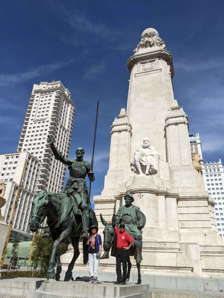 一下飞机, 我们径直奔向事先找好的旅馆。 这家旅馆, 离各著名景点不远, 价钱不太贵且口碑较好。 安顿好房间, 我们就到旅馆外面转, 熟悉一下环境。 没想到,我们的旅馆正好在西班牙议会大楼的后面, 一上街就看见宏伟的议会大厦, 门前用铜雕塑的两只雄狮硕大威武。 大街对面有一个广场, 安放着一座雕像。这是不能错过的, 于是我就走了过去。 塑像并不很高大, 但与整洁安静的广场很相配。 原以为这可能是一个历史人物, 或政治家, 或军事家的雕像,人物自然是不识得的, 只好转到正面看撰刻的文字。 西班牙语与英语虽为不同语言,但均属印欧语系,硬读出声来也是八九不离十的。 一读, 发现这竟是大作家塞万提斯的 雕像。刚到马德里就与塞万提斯打了个照面!