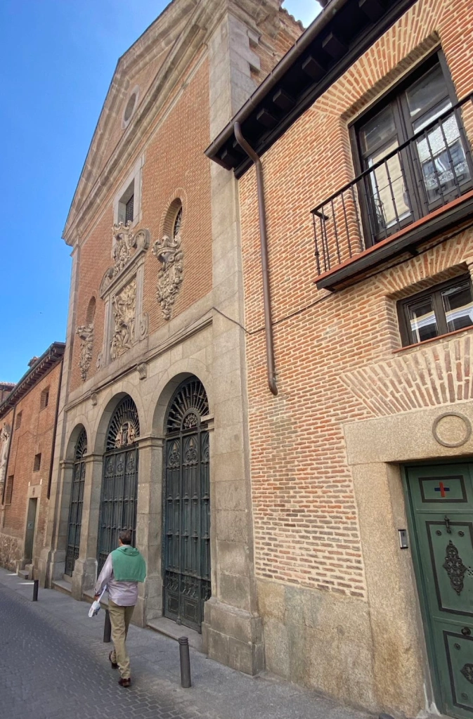 塞万提斯的墓葬地址并不广为人知, 尤其对游客来讲。 我在网上查到了这个修道院, 在GPS指引下穿街越巷,终于找到了这个修女院。 这里仍然有13位修女在修行。 在通过门上的语音传达与里面的修女联系上后被告知这里平日不接待游客到访。 在通话期间陆续有游客慕名前来, 不乏讲西班牙语的人。 他们看到门上的告示, 对我们讲修道院每周在固定做弥撒的时间开放, 可惜我们的时间不容许, 只得悻悻离开。 下面这张照片就是这个三位一体修道院的外貌,该修道院已有 400 多年历史了。