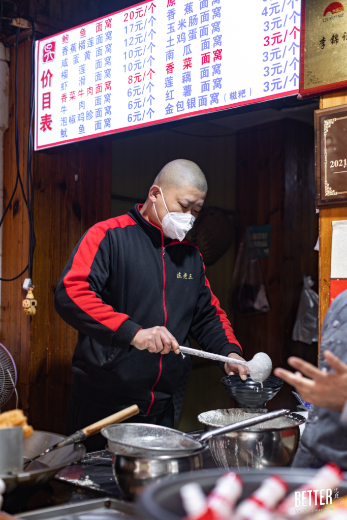 后湖的尹记牛肉热干面门口,有个话少木讷的师傅卖了三年面窝,只有附近的熟客和慕名而来的客人才知道,摊子有个隐藏菜品——鸡蛋面窝。